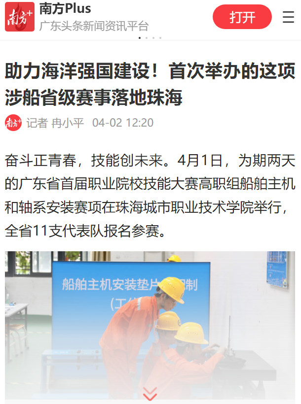 (机电工程学院 报道)4月1日至2日,广东省职业院校技能大赛高职组船舶主机和轴系安装赛项在我校顺利举办,来自全省11支代表队40余名师生报名参加。此次赛事在广东省是首次举办,是全省涉船类职业院校的一件盛事,相关媒体报道了这一盛事。
