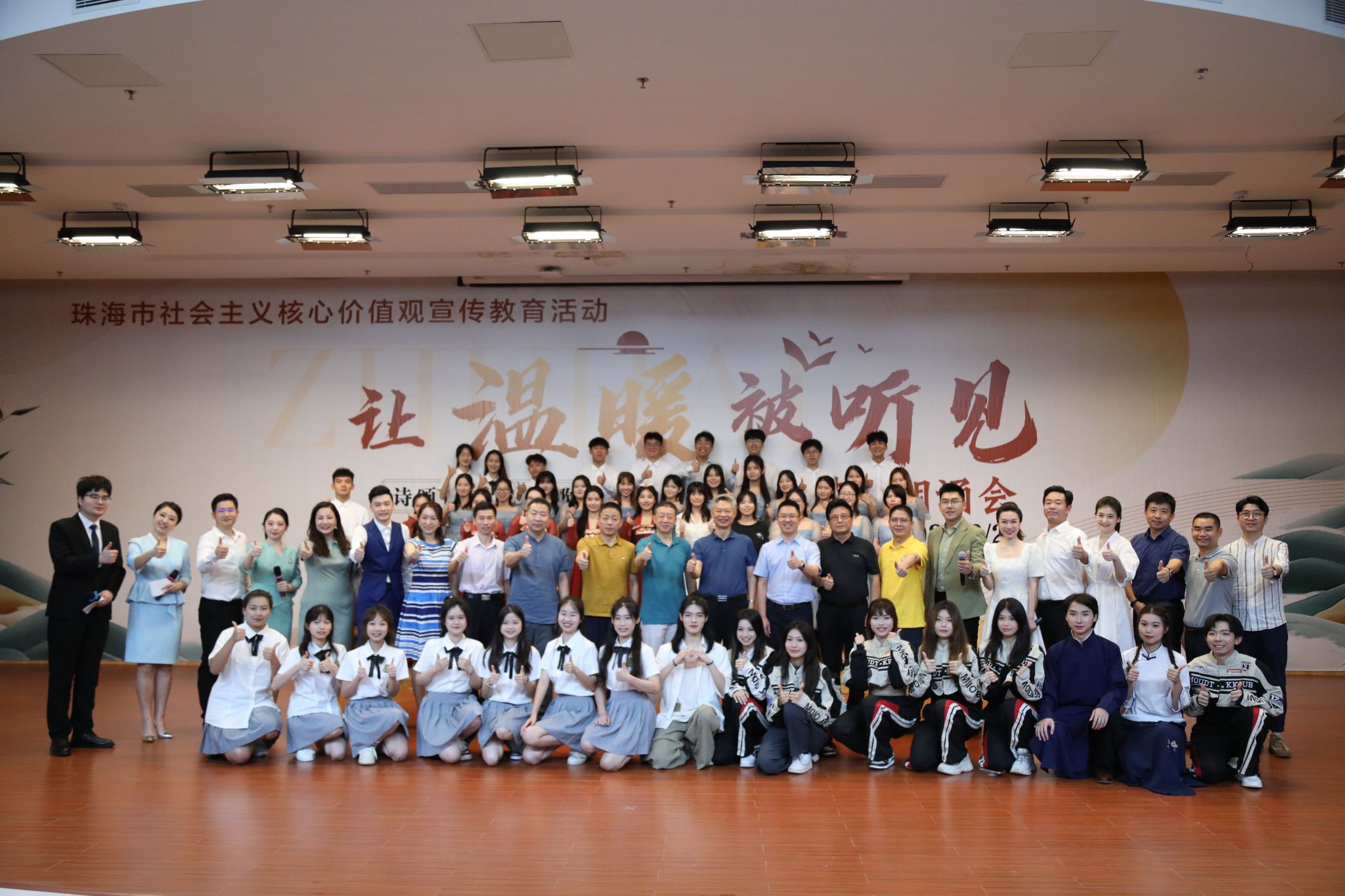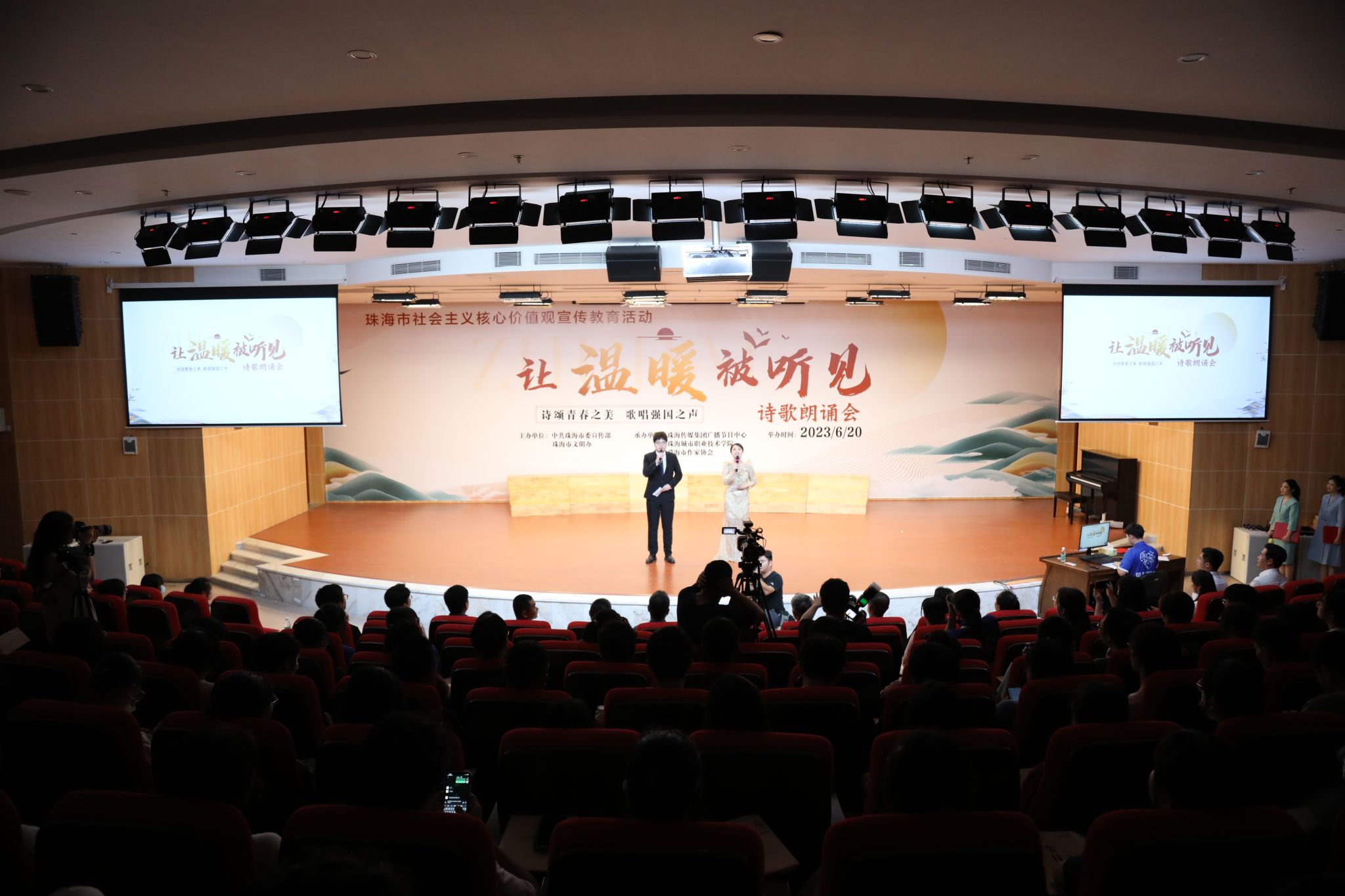 (党委宣传部 报道)6月20日晚,珠海市社会主义核心价值观宣传教育活动暨“让温暖被听见”诗歌朗诵会在我校香山楼美育报告厅举行。