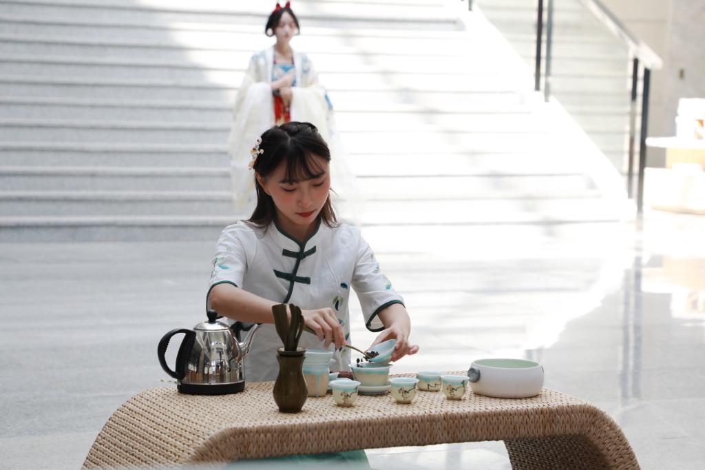 在汉服走秀的同时,还有同学进行茶艺表演。茶艺是我国传统与文化的代表之一,体现了独特的文化魅力。氤氲茶香中,同学们用一把壶、一个杯,在一低眉、一抬眸、一举手、一投足间,展现出了“礼、雅、柔、美、静”的茶艺之韵,演绎出了茶文化的丰富内涵。现场师生闻香品茗、心静思远,赞许的目光尽在一杯一缕之间。