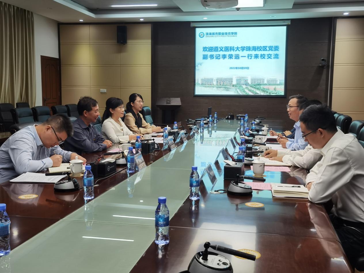 (党委组织部 报道)10月19日上午,遵义医科大学珠海校区党委副书记李荣远同志带队来我校交流党建属地管理工作经验,学校党委副书记唐顺铁与学校党委委员、组织部部长金焕等同志出席了本次会议。