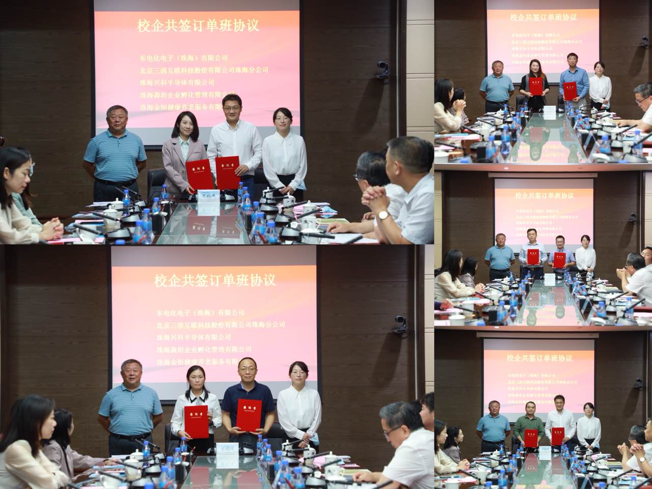 会上,金湾智造产业学院办公室汇报了金湾智造产业学院工作成效及下一步工作思路。珠海迈科智能科技股份有限公司、和氏工业技术股份有限公司、东电化电子(珠海)有限公司企业代表就校企合作情况进行了发言。会上还进行了订单班签约仪式和大学生校外实践教学基地授牌仪式。