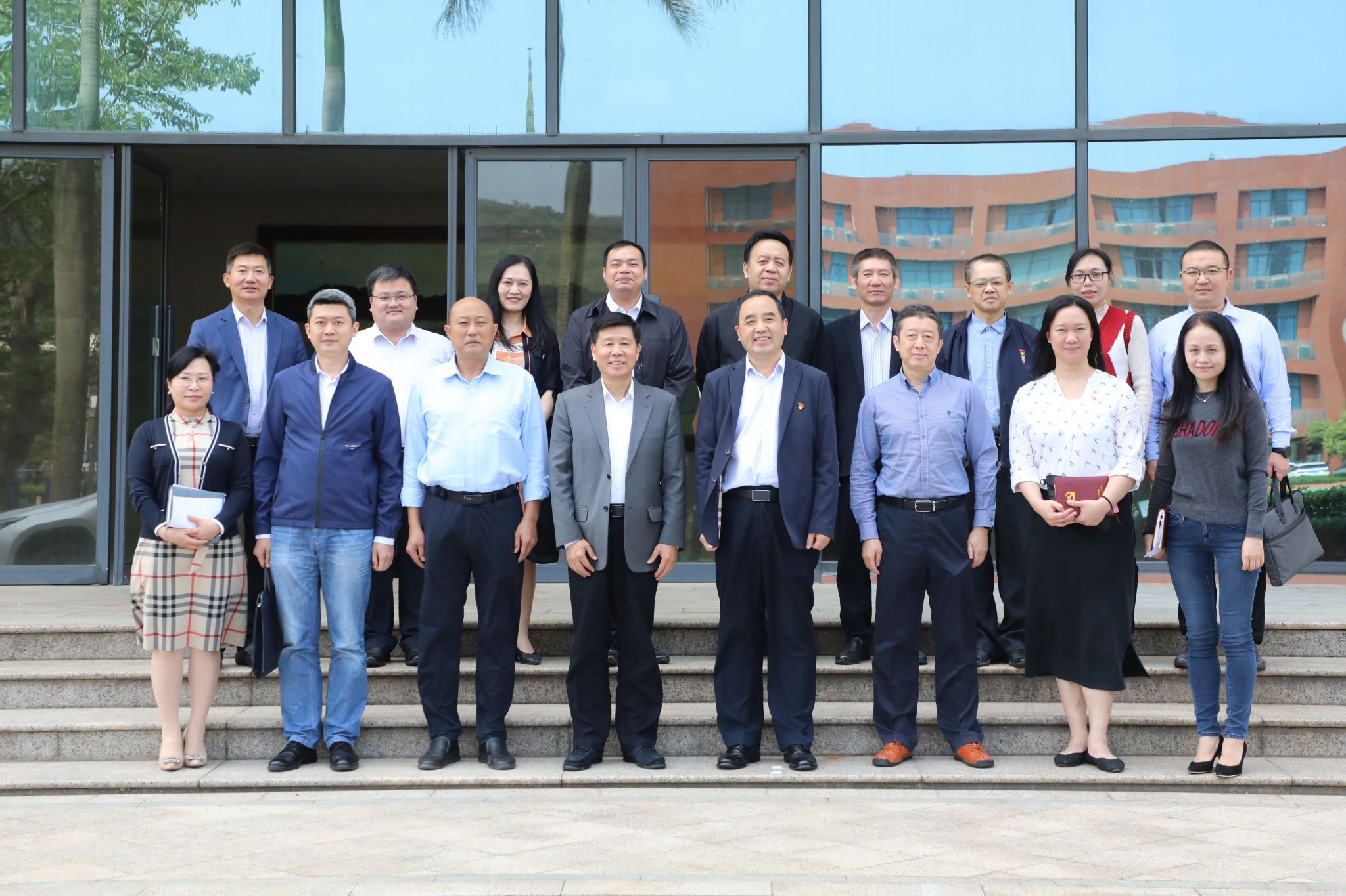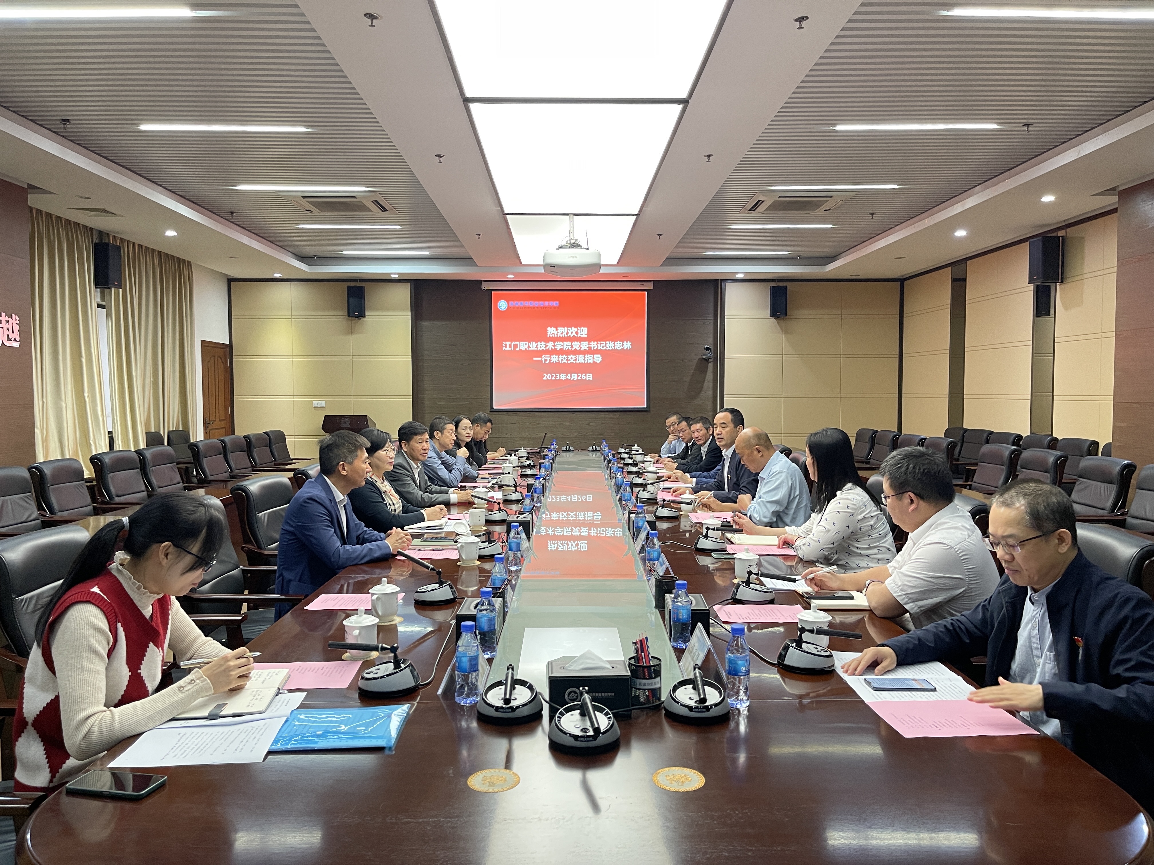(党政办公室 报道)4月26日上午,江门职业技术学院党委书记张忠林、纪委书记黄煜熙一行来我校交流。学校党委书记钟以俊,党委委员、宣传部部长周剑平,党委委员、组织部部长金焕等相关部门负责人接待了来访客人并进行了座谈。