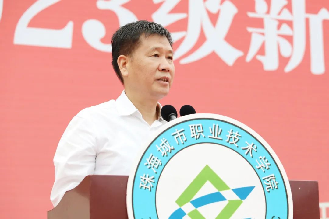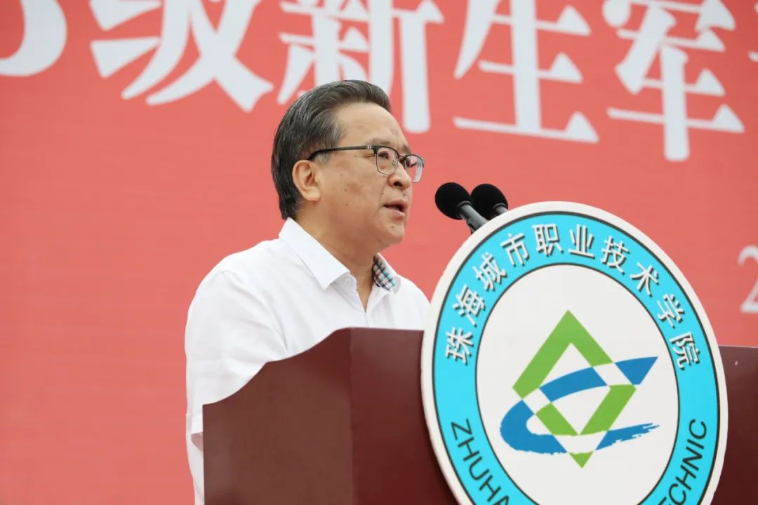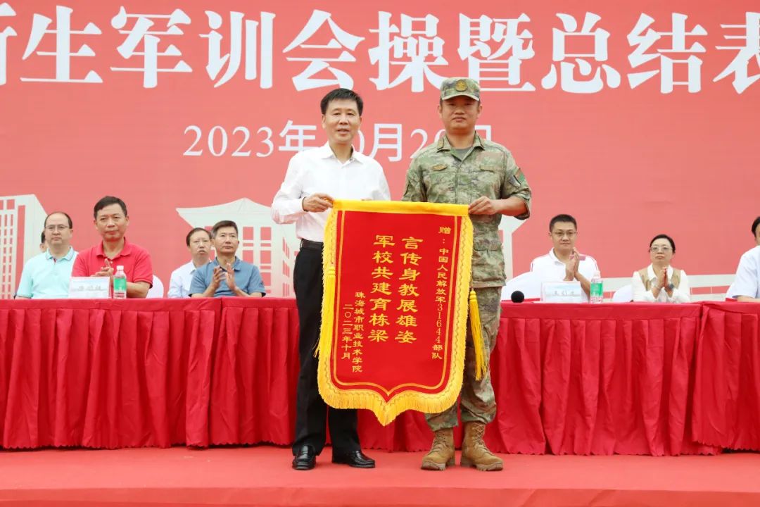 学校党委书记钟以俊代表学校向为军训付出辛勤劳动的教官、老师表示衷心的感谢,希望全体新生在以后的求学生涯中,能够继续保持良好的生活习惯,继续发扬吃苦精神,求真学问、学真本领、修好品行,与学校携手并进,在追求中进步、在奋斗中成长、在挑战中超越。