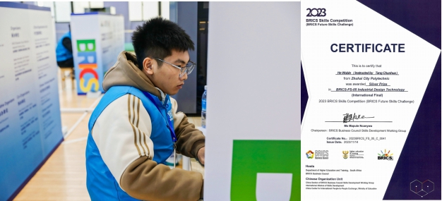 (机电工程学院 报道)11月17-19日, 2023金砖国家职业技能大赛工业设计技术赛项国际总决赛在宁波举行,该赛项吸引来自全国39所职业院校的参赛队伍和俄罗斯、印度、加纳的17支国际参赛队以线上线下相结合的方式同台共竞。我校参赛选手何武斌同学(指导教师唐春华)以区域选拔赛第一名的好成绩晋级总决赛,决赛中何武斌同学经过连续8个小时的奋力拼搏,在数字建模、测绘建模、创新设计、装配验证、3D打印等模块竞赛中表现优异,取得第二名的好成绩,荣获本赛项国际总决赛银牌,指导教师荣获“优秀指导专家”称号!