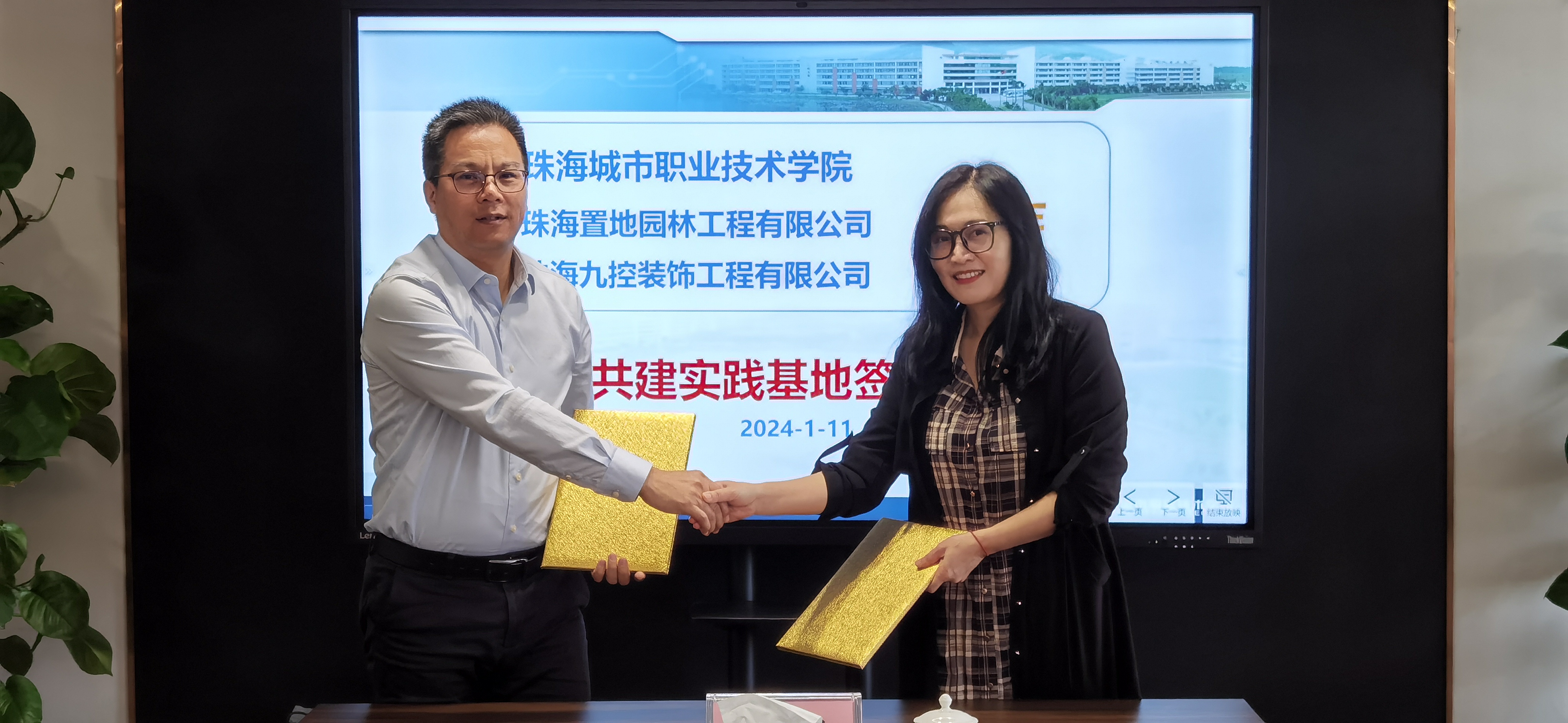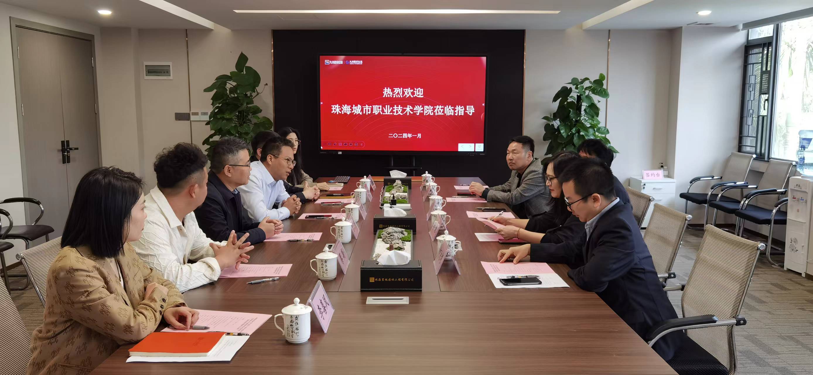 (人文学院 报道)1月11日上午,我校人文学院与九洲控股旗下子公司珠海置地园林工程有限公司、珠海九控装饰工程有限公司校外实践基地签约暨挂牌仪式在珠海置地园林工程有限公司举办。我校校企合作处副处长梅伯平,人文学院党总支书记李妮、院长赵国宏、副院长何永根及珠海置地园林工程有限公司、珠海九控装饰工程有限公司的执行董事谭卫刚,总经理助理谢中帅、曾三明,业务部副总经理蔡斯、李喜凤,综合管理部副总经理吴燕纯等双方代表参加了仪式并开展座谈。