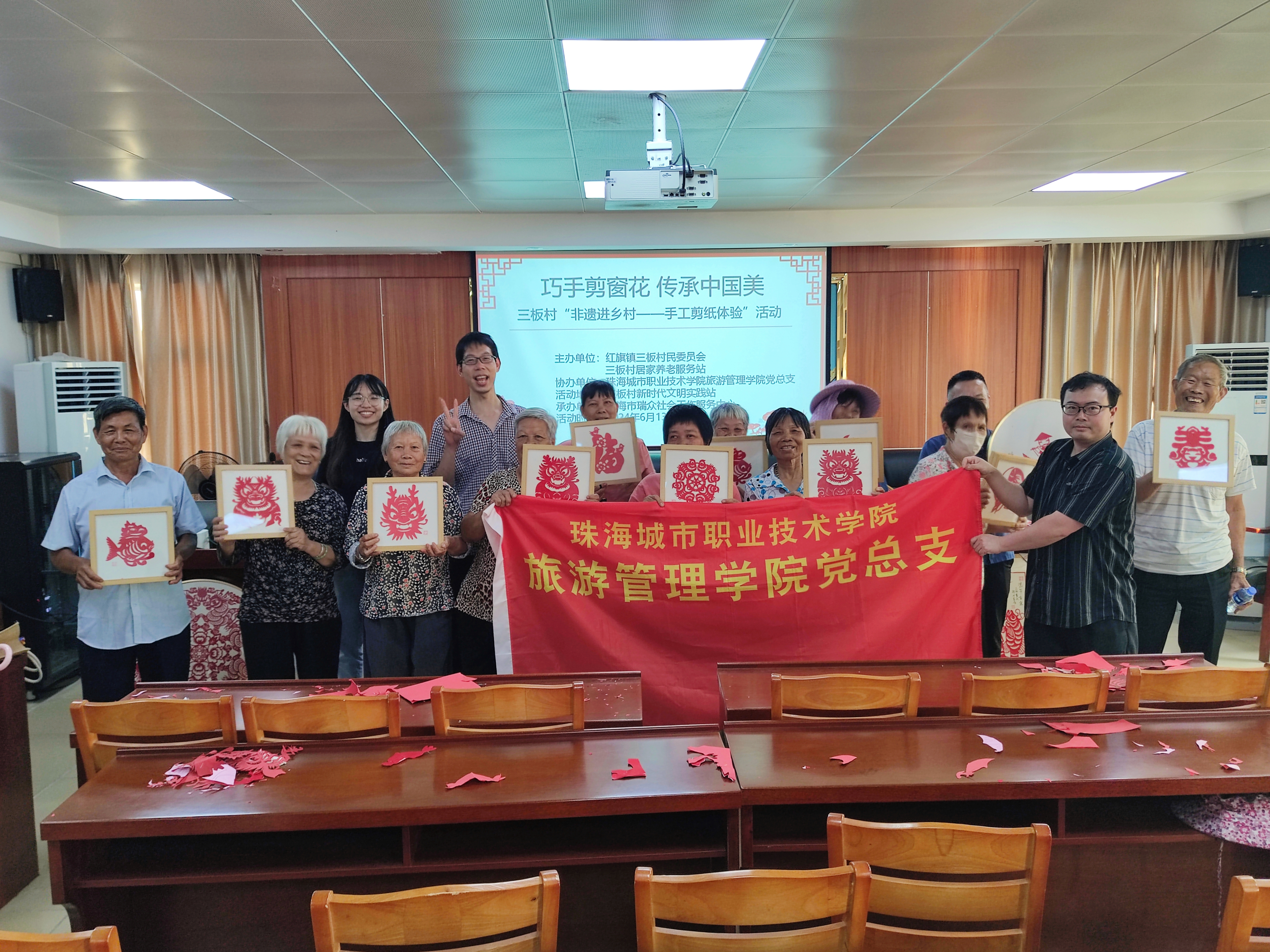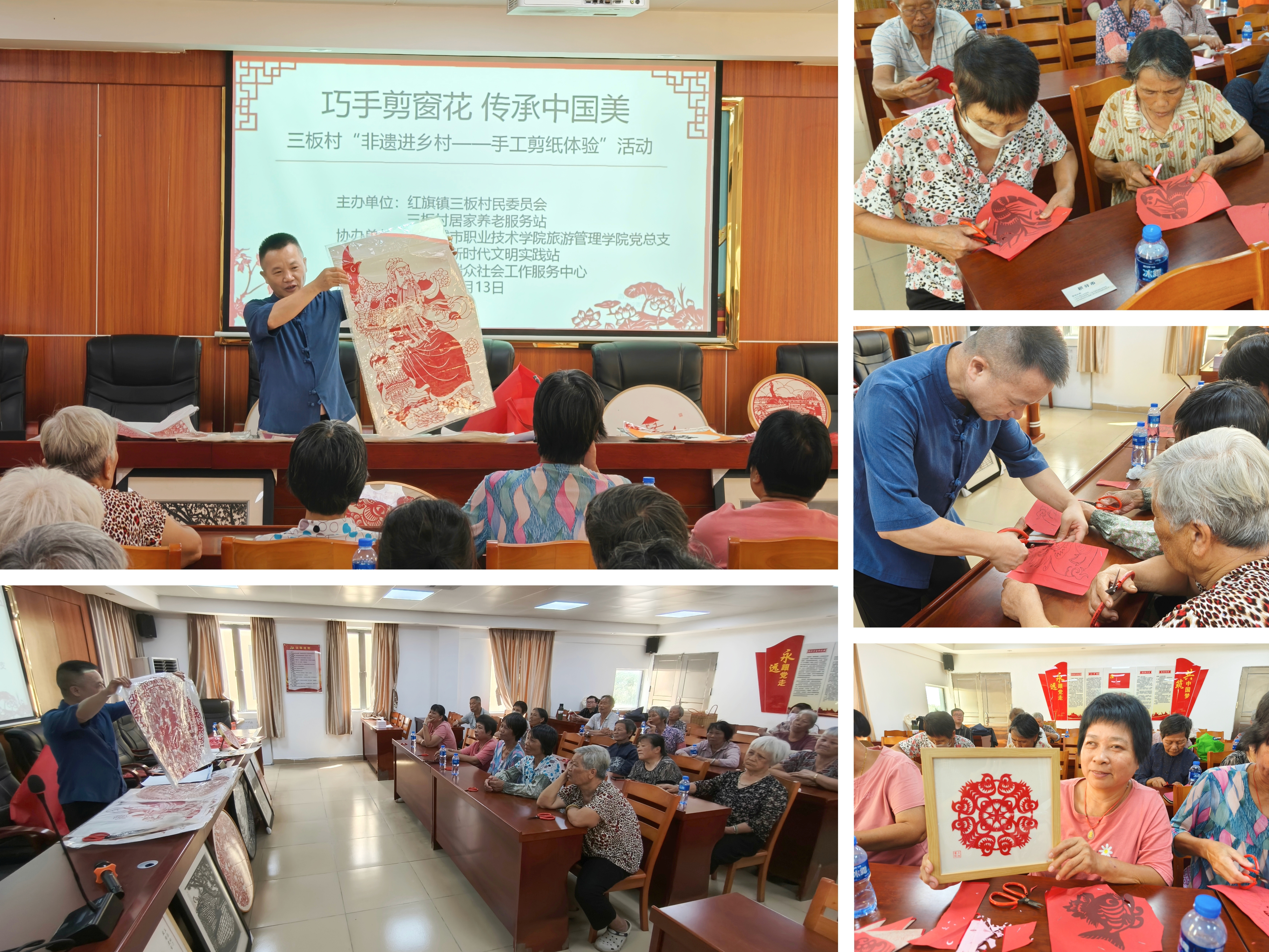 (旅游管理学院 报道)为了更好地弘扬中华优秀传统文化,深化互助养老服务的开展,丰富三板村长者的精神文化生活,实现“老有所依、老有所乐”的目标,同时助力“百千万工程”,6月13日下午,旅游管理学院党总支联合党建共建单位三板村党总支,在三板村新时代文明实践站成功举办了“巧手剪窗花·传承中国美”三板村“非遗进乡村——手工剪纸体验”活动,共吸引了25名长者积极参与。