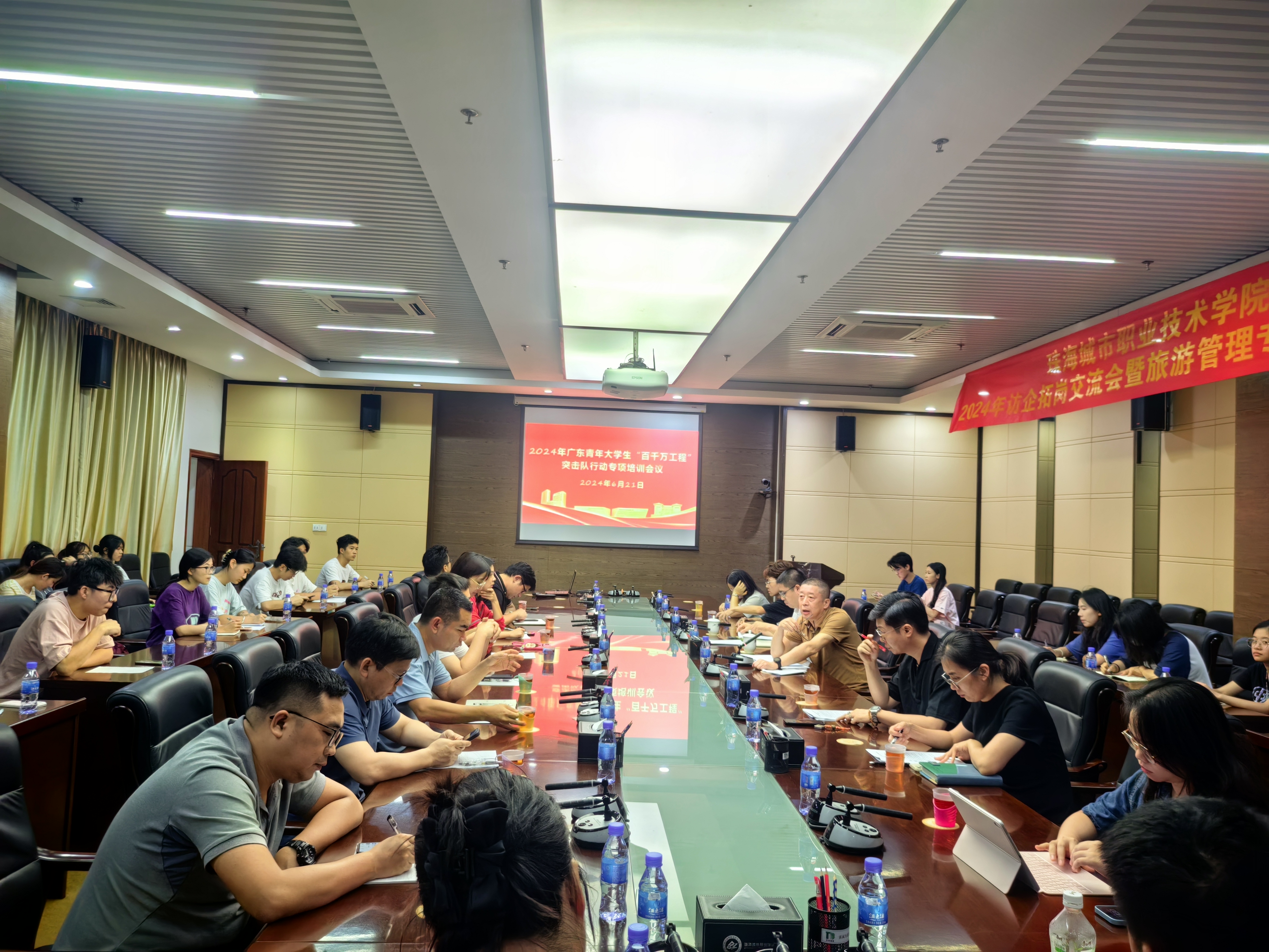 (校团委 报道)6月21日下午,我校召开2024年广东青年大学生“百千万工程”突击队行动岗前培训会。学校党委委员、宣传部部长周剑平及各二级学院党总支副书记、各立项团队指导老师、学生负责人参加了会议。