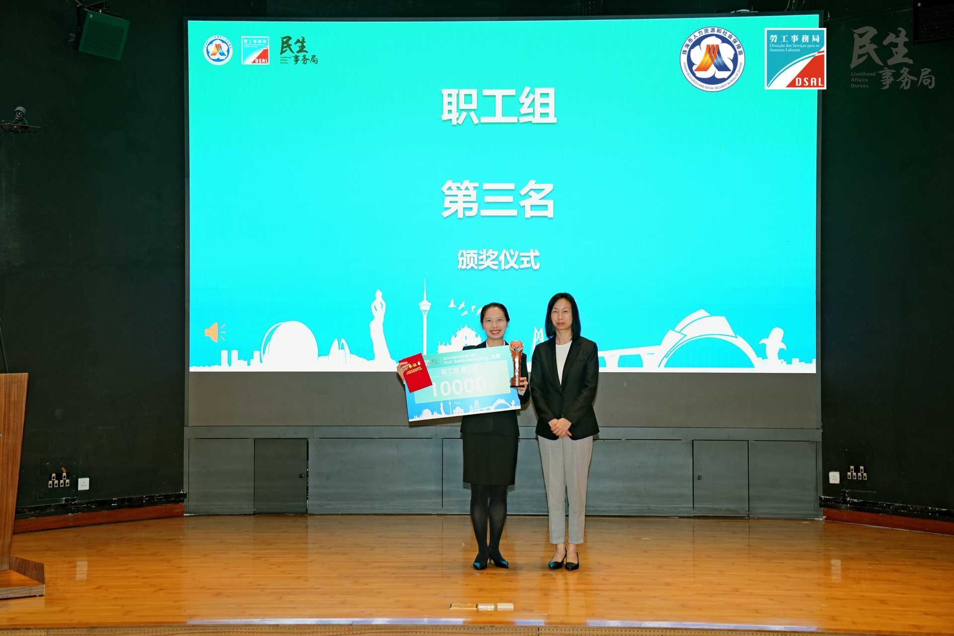(旅游管理学院 报道)10月23日,2024年珠澳琴职业技能大赛暨“深合杯”职业技能竞赛酒店接待项目在澳门旅游大学望厦校区大礼堂圆满落下帷幕。我校旅游管理学院教师周慧芝凭借出色的表现荣获职工组第三名,并被授予“珠海市技术能手”称号。我校旅游管理学院学生李文静、林秀霞、邓雨昕三位同学分别荣获学生组第二名、第四名和第五名的优异成绩。