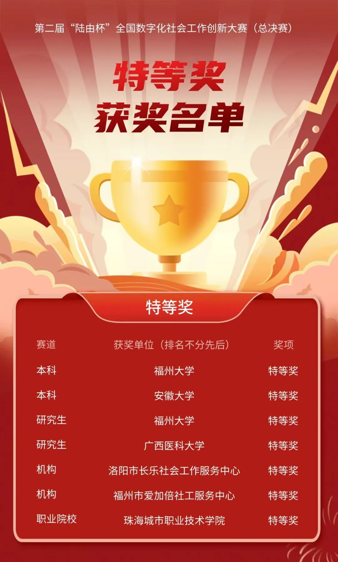 本次总决赛设置了“数字化软件平台操作模拟”与“创新实践案例构想答辩”两大核心环节,既考验选手的数字化实操能力,也深度检验其创新思维与专业应用水平。比赛中,我校四位学子在数字化软件平台操作模拟环节沉着应战、默契协作,凭借娴熟的操作技能与高效的问题解决能力一路突破,以职业院校赛道第一名的优异成绩强势晋级创新实践案例构想答辩环节。在该环节,面对同台竞技的16支本科生、研究生及机构社工团队,我校团队毫不怯场,不仅清晰阐述了自身的创新案例构想,更以诚恳态度从容应对评委提问,最终凭借全程稳定的发挥与突出的综合实力,成功摘得特等奖,成为本次决赛中唯一获此最高荣誉的职业院校,为学校赢得了宝贵荣誉。