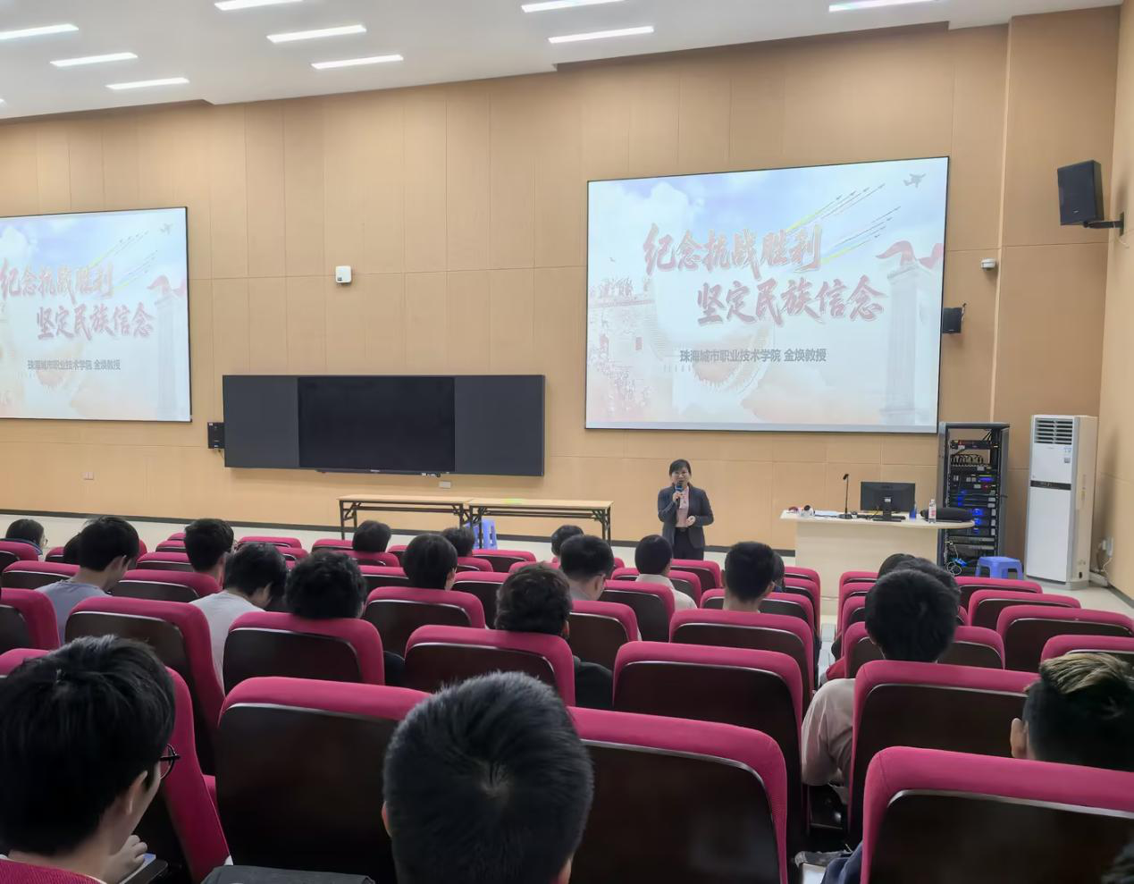 金焕副校长在思政课上系统讲授了从局部抗战到全面抗战的的十四年艰难曲折历程,深刻阐释了中华民族存亡危急之际所展现的坚定信念与伟大抗战精神。在互动环节中,她与学生亲切交流,耐心倾听学生的提问与见解,结合历史与现实予以回应,并勉励青年学子从抗战精神中汲取爱国情怀和奋斗力量,把个人成长自觉融入国家发展新征程。同学们踊跃发言,畅谈体会,课堂气氛庄重而热烈。