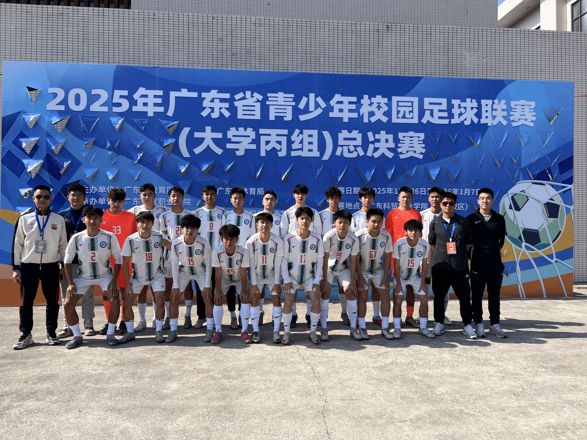 (公共体育部 报道)2025年12月26日至2026年1月7日,由广东省教育厅主办,广东省体育局与广东科贸职业学院共同承办的2025年广东省青少年校园足球联赛(大学丙组)总决赛在广东科贸职业学院举行。经过多轮激烈角逐,我校男子足球队凭借出色表现,荣获丙B组一等奖(第四名),并成功取得晋级丙A组的资格。我校足球队教练蔡志廉、周德武、赵迅三位老师同时获评“优秀教练员”称号。这是我校足球队继2023年夺得该赛事第三名后,再次闯入全省四强。