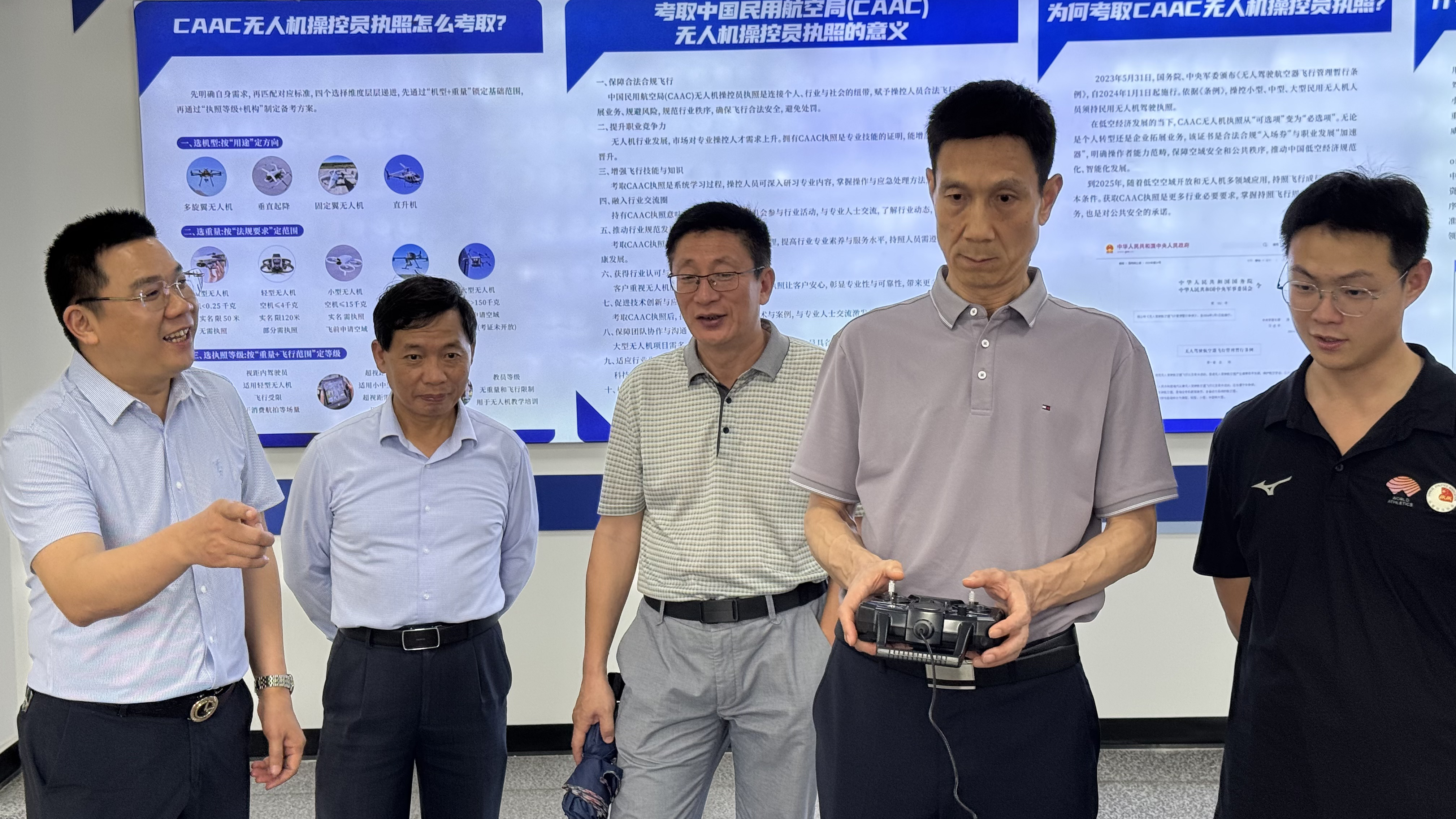 随后调研组前往无人机培训中心,参观调研无人机培训项目,现场体验无人机模拟飞行教学设备。
