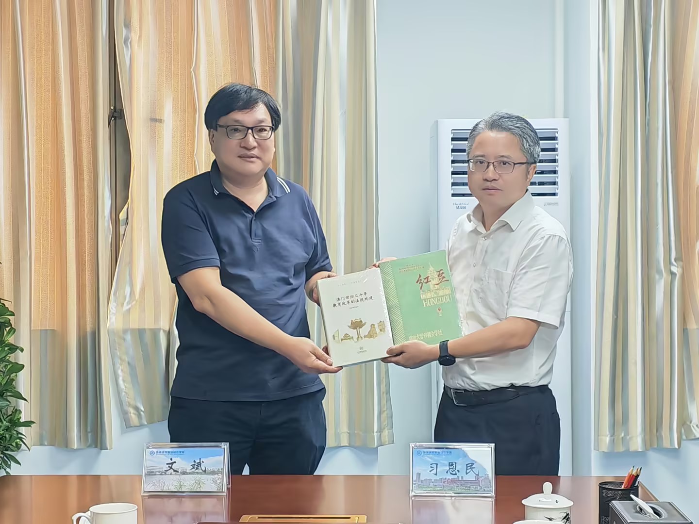 座谈结束后,文斌会长向我校图书馆捐赠图书80册,包括《红豆杂志结集》《澳门回归二十年教育改革的法规构建》及个人专著《湘刀文斌谈艺录》《说爨—— 湘刀文斌谈艺录系列(二)》《<金刚经>—— 湘刀文斌篆刻作品》等精品书籍,以实际行动丰富我校图书馆馆藏资源,助力书香校园建设与校园文化品质提升。