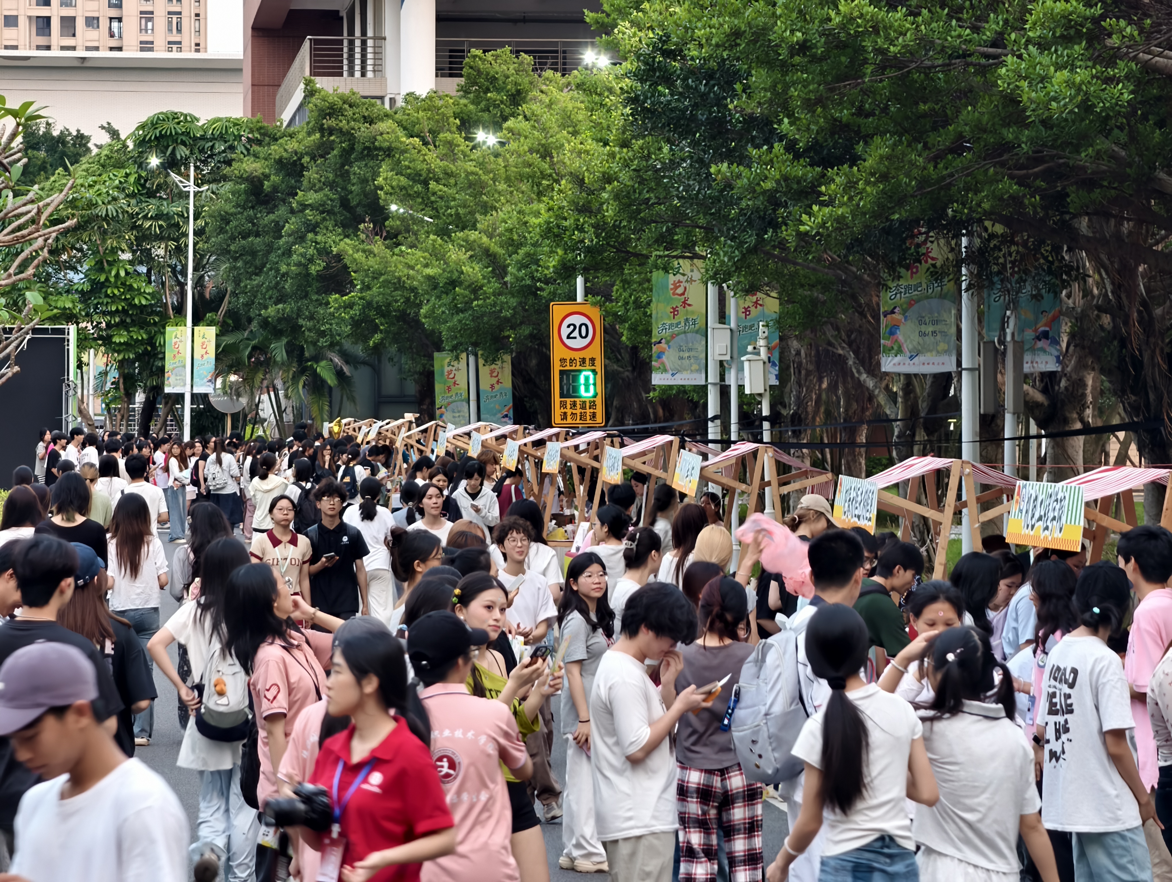 本次集市内容丰富、形式多样,涵盖文创、家乡特产、传统手工艺、书籍、手信、饰品、创意、公益八大主题、40个摊位。当天,醒狮社、街舞社、话剧社、406乐团等社团参与了节目展演,趣味互动游戏、特色美食体验等活动同步开展,师生同乐、其乐融融,充分展现了校园青春活力。