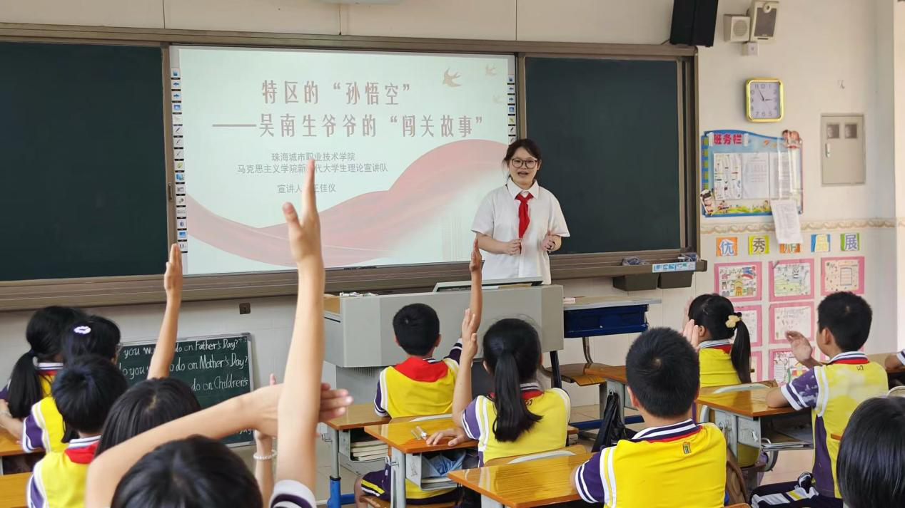 (马克思主义学院 报道)为传承“敢闯敢试、敢为人先”的特区精神,厚植青少年红色信仰,4月22日下午,马克思主义学院知行社走进珠海市斗门区马山小学,开展三场主题鲜明、形式新颖的思政宣讲活动,用鲜活故事讲述特区建设者与革命先辈的奋斗历程,以榜样故事传递精神力量,让红色薪火与特区精神浸润童心。